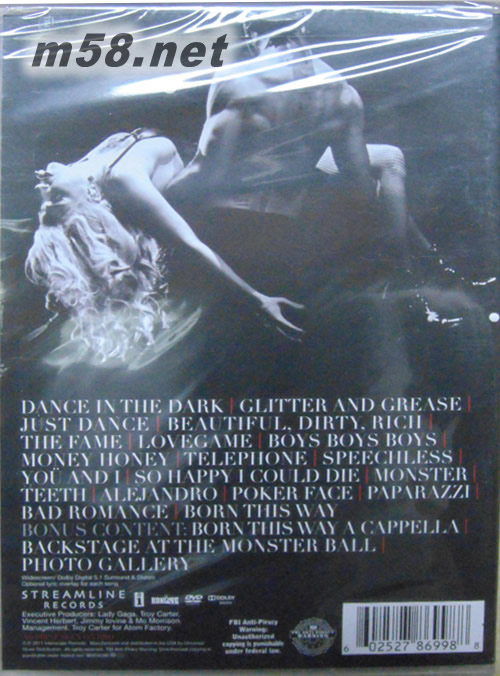 01. Intro 02. Dance In The Dark 03. Glitter & Grease 04. Just Dance 05. Beautiful, Dirty, Rich 06. The Fame 07. LoveGame 08. Boys, Boys, Boys 09. Money Honey 10. Telephone 11. Speechless 12. Yoü And I 13. So Happy I Could Die 14. Monster 15. Teeth 16. Alejandro 17. Poker Face 18. Paparazzi 19. Bad Romance 20. Born This Way 21. Born This Way A Cappella 22. Backstage At The Monster Ball 23. Photo Gallery / Lady Gaga / The Monster Ball Tour