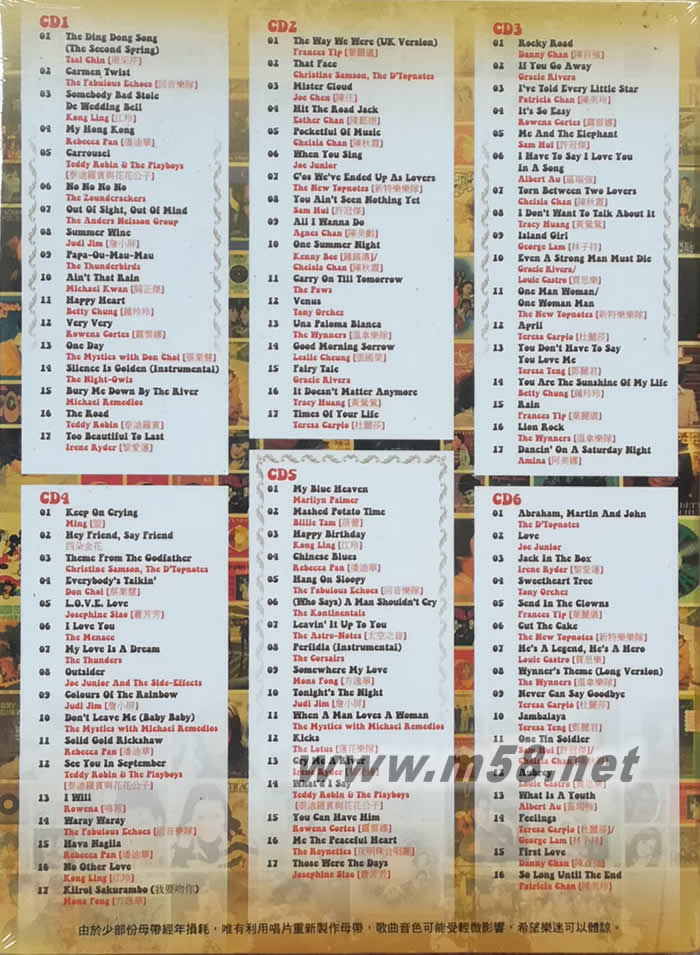 CD 1 01. The Ding Dong Song (The Second Spring) - Tsai Chin Zhou [周采芹] (風(fēng)行海外改編華語歌的英文歌 / 樂迷尋找經(jīng)年, 環(huán)球首度CD收錄) 02. Carmen Twist – The Fabulous Echoes [回音樂隊(duì)] (卡門 Rock & Roll 版本 / 首度CD收錄) 03. Somebody Bad Stole De Wedding Bell - Kong Ling [江玲] (首度CD收錄) 04. My Hong Kong - Rebecca Pan [潘迪華] (1966年在英國推廣香港旅游活動宣傳片主題曲﹔潘迪華在英國灌錄及推出的細(xì)碟) 05. Carrousel - Teddy Robin & The Playboys [泰迪羅賓與花花公子] (手表廣告歌) 06. No No No No - The Zoundcrackers (Joe Junior 早期樂隊(duì) / 首度CD收錄) 07. Out Of Sight, Out Of Mind - Anders Nelsson Group (Anders Nelsson 60年代樂隊(duì)) 08. Summer Wine - Judi Jim [詹小屏] (首度CD收錄) 09. Papa-Ou-Mau-Mau - The Thunderbirds (林振強(qiáng)+李振輝 60年代的樂隊(duì)) 10. Ain’t That Rain - Michael Kwan [關(guān)正杰] (關(guān)正杰60年代細(xì)碟歌 / 首度CD收錄) 11. Happy Heart - Betty Chung [鍾玲玲] (首度CD收錄) 12. Very Very - Rowena Cortes [露云娜] (露云娜5歲時(shí)的錄音 /首度CD收錄) 13. One Day - The Mystics with Don Choi [蔡業(yè)慧] 14. Silence Is Golden (Instrumental) - The Night-Owls (樂隊(duì)成員包括 鄭東漢 + 馮添枝 + Donald Ashley + Nick Domingo / 首度CD收錄) 15. Bury Me Down By The River - Michael Remedios (香港 寶麗多 品牌首張大碟 / 首度CD收錄) 16. The Road - Teddy Robin [泰迪羅賓] (泰迪羅賓1971年新加坡灌錄的 EP / 首度CD收錄) 17. Too Beautiful To Last - Irene Ryder [黎愛蓮] (首度CD收錄) CD 2 01. The Way We Were (UK Version) - Frances Yip [葉麗儀] (葉麗儀英國推出首張大碟 / 首度CD收錄) 02. That Face - Christine Samson﹐The D’Topnotes (遺失多年的細(xì)碟錄音 / 首度CD收錄) 03. Mister Cloud - Joe Chen [陳任] (陳任70年代個人發(fā)展錄音 /首度CD收錄) 04. Hit The Road Jack - Esther Chan [陳懿德] (首度CD收錄) 05. Pocketful Of Music - Chelsia Chan [陳秋霞] (許冠杰“大家跟住唱”英文原版) 06. When You Sing - Joe Junior (1975年香港流行創(chuàng)作邀請賽殿軍歌曲) 07. C’os We’ve Ended Up As Lovers - The New Topnotes [新特樂樂隊(duì)] (成員包括 鍾定一 + 陳潔靈 + 葉振棠 等人) 08. You Ain’t Seen Nothing Yet - Sam Hui [許冠杰] 09. All I Wanna Do - Agnes Chan [陳美齡] (陳美齡罕有EMI錄音) 10. One Summer Night - Chelsia Chan [陳秋霞], Kenny Bee [鍾鎮(zhèn)濤] (陳秋霞風(fēng)靡韓國樂迷之作) 11. Carry On Till Tomorrow - The Paws (袁麗嫦早期民歌隊(duì) / 首度CD收錄) 12. Venus - Tony Orchez (60/70年代名DJ / 首度CD收錄) 13. Una Paloma Blanca - The Wynners [溫拿樂隊(duì)] (“趁放假要去開心”原曲) 14. Good Morning Sorrow - Leslie Cheung [張國榮] (“遲來的春天”英文版) 15. Fairy Tales - Gracie Rivera (首度CD收錄) 16. It Doesn’t Matter Anymore - Tracy Huang [黃鶯鶯] (“天光天黑對住你”原曲) 17. Times Of Your Life - Teresa Carpio [杜麗莎] (膾炙人口的菲林/咖啡廣告歌 / 首度CD收錄) CD 3 01. Rocky Road - Danny Chan [陳百強(qiáng)] (陳百強(qiáng)第一首發(fā)表的創(chuàng)作) 02. If You Go Away - Gracie Rivera (首度CD收錄) 03. I’ve Told Every Little Star - Patricia Chan [陳美玲] (首度CD收錄) 04. It’s So Easy - Rowena Cortes [露云娜] (首度CD收錄) 05. Me And The Elephant - Sam Hui [許冠杰] 06. I Have To Say I Love You In A Song - Albert Au [區(qū)瑞強(qiáng)] 07. Torn Between Two Lovers - Chelsia Chan [陳秋霞] 08. I Don’t Want To Talk About It - Tracy Huang [黃鶯鶯] (“情難自控”原曲) 09. Island Girl - George Lam [林子祥] (首度CD收錄) 10. Even A Strong Man Must Die - Gracie Rivera, Louie Castro [賈思樂] (1977年向 李小龍 致敬的電影歌 / 香港首度推出錄音 / 首度CD收錄) 11. One Man Woman / One Woman Man - The New Topnotes [新特樂樂隊(duì)] (成員包括 鍾定一 + 陳潔靈 + 葉振棠 等人) 12. April - Teresa Carpio [杜麗莎] (林子祥第一首發(fā)表的創(chuàng)作 / 首度CD收錄) 13. You Don’t Have To Say You Love Me - Teresa Teng [鄧麗君] 14. You Are The Sunshine Of My Life - Betty Chung [鍾玲玲] (首度CD收錄) 15. Rain - Frances Yip [葉麗儀] 16. Lion Rock - The Wynners [溫拿樂隊(duì)] 17. Dancin’ On A Saturday Night - Amina [阿美娜] (筷子姊妹花 成員 / 首度CD收錄) CD 4 01. Keep On Crying - Ming [盟] (成員包括 Anders Nelson + 鄔瑪莉 等人 / 首度CD收錄) 02. Hey Friend, Say Friend – 四朵金花 (沉殿霞+汪明荃+王愛明+張圓圓) 03. Theme From The Godfather - Christine Samson, The D’Topnotes (遺失多年的細(xì)碟錄音 / 首度CD收錄) 04. Everybody’s Talkin’ - Don Choi [蔡業(yè)慧] (The Mystics 主音/ 首度CD收錄) 05. L.O.V.E. Love - Josephine Siao [蕭芳芳] 06. I Love You - The Menace (陳任60年代的樂隊(duì)) 07. My Love Is A Dream - The Thunders (60年代澳門首隊(duì)過江龍樂隊(duì)) 08. Outsider - Joe Junior & The Side Effects (Joe Junior 向偶像 Cliff Richard 致敬的翻唱歌 /首度CD收錄) 09. Colours Of The Rainbow - Judi Jim [詹小屏] (“忘不了的你”英文版) 10. Don’t Leave Me (Baby Baby) – The Mystics with Michael Remedios (首度CD收錄) 11. Solid Gold Rickshaw - Rebecca Pan [潘迪華] (商業(yè)電臺高層/潘迪華的老師 為Rebecca 度身訂造的創(chuàng)作) 12. See You In September - Teddy Robin & The Playboys [泰迪羅賓與花花公子] 13. I Will - Rowena [鳴茜] (“公子多情”原唱人 / 首度CD收錄) 14. Waray Waray – The Fabulous Echoes [迴音樂隊(duì)] (首度CD收錄) 15. Hava Nagila - Rebecca Pan [潘迪華] (潘迪華代表作) 16. No Other Love - Kong Ling [江玲] (首度CD收錄) 17. Kiiroi Sakurambo (我要吻你) - Mona Fong [方逸華] (