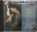 Decca公司這款著名的室內(nèi)樂(lè)唱片是由小提琴家鄭京和 (Kyung Wha Chung)與鋼琴家拉杜?魯普(Radu Lupu)合作灌錄的。 弗朗克的《A大調(diào)小提琴奏鳴曲》集中體現(xiàn)了他的創(chuàng)作特征:旋律氣質(zhì)不凡,表現(xiàn)力深刻,和聲新穎,結(jié)構(gòu)堅(jiān)實(shí)協(xié)調(diào)。弗朗克于1886年完成這首《A大調(diào)小提琴奏鳴曲》,時(shí)年63歲,正處于創(chuàng)作的巔峰期。就像他其他作品一樣,這首奏鳴曲是循環(huán)式的,四個(gè)樂(lè)章的主題素材都源自單一的原始動(dòng)機(jī)。第一章的開(kāi)場(chǎng)小節(jié)引出這個(gè)動(dòng)機(jī),小提琴安詳?shù)匾耘靡糁髯嘀黝},將鋼琴微妙的四小節(jié)冥想具體化。主題以詩(shī)歌般的長(zhǎng)度來(lái)鋪陳,先是被抑制,然后抒情性逐漸加強(qiáng)。熱情的第二樂(lè)章與這種幻想的曲風(fēng)形成強(qiáng)烈對(duì)比,十分激烈,雖然其中也有一些田園詩(shī)般慵懶的樂(lè)段。 鄭京和是韓國(guó)當(dāng)代女小提琴大師,她9歲在漢城交響樂(lè)隊(duì)合作下演奏門(mén)德?tīng)査傻男√崆賲f(xié)奏曲,19歲獲美國(guó)勃文垂特國(guó)際比賽一等獎(jiǎng)。1967年獲利文特里特國(guó)際小提琴競(jìng)賽一等獎(jiǎng)。1968年與紐約曼樂(lè)管弦樂(lè)團(tuán)合作在紐約首次演出獲很大成功,后多次與歐美亞著名管弦樂(lè)團(tuán)合作演出。1970年與普列文指揮的倫敦交響樂(lè)團(tuán)合作演出柴可夫斯基小提琴協(xié)奏曲,大為轟動(dòng),從此確立了這位極富自發(fā)性的女小提琴家在20世紀(jì)后期國(guó)際樂(lè)壇的地位。其演奏有精確的節(jié)奏感和透明清純的音質(zhì),感情非常豐富,美妙的抒情味能滲入作品的深處。 羅馬尼亞鋼琴家拉杜?魯普6歲學(xué)琴,12歲登臺(tái)演奏,他的鋼琴老師穆濟(jì)切斯庫(kù)也是李帕蒂的老師,1963年獲獎(jiǎng)學(xué)金到莫斯科音樂(lè)學(xué)院在涅高茲班上學(xué)習(xí)。1966年獲克萊本國(guó)際比賽獎(jiǎng),1967年獲埃乃斯庫(kù)比賽獎(jiǎng),1969年又獲利茲國(guó)際比賽獎(jiǎng)。魯普的演奏追求音的微妙與流暢,在微妙的音中追求透明的陰影感;追求強(qiáng)音及它所造成的鮮明的明暗效果,強(qiáng)調(diào)動(dòng)態(tài)與幅度。魯普演奏的舒伯特、勃拉姆斯及與戈?duì)柕卤ず献鞯哪匦√崆僮帏Q曲最具特色。
