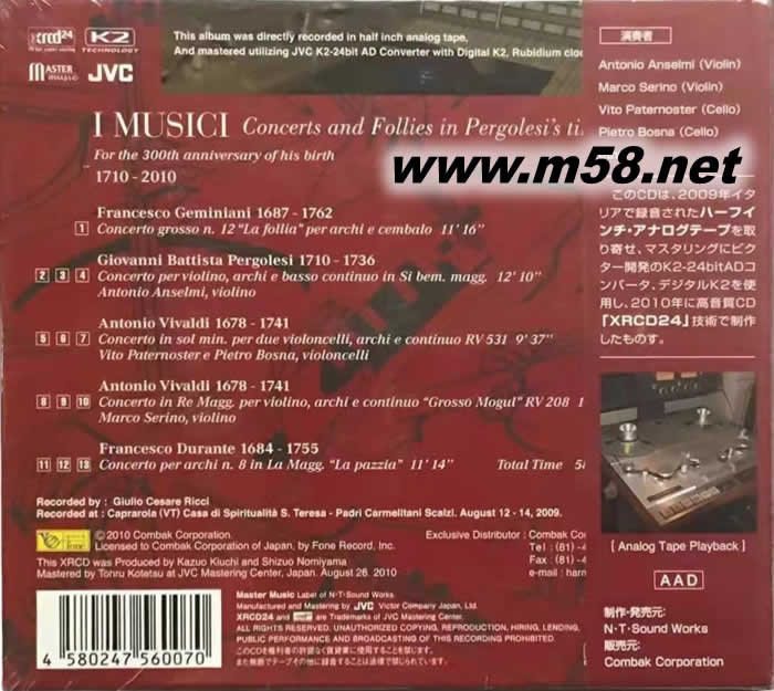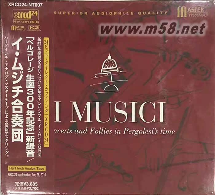Concerts & Follies in Pergolesi's Time XRCD日本版 紅色封面(m58.net) 這是意大利國(guó)寶「意大利音樂(lè)家合奏團(tuán)」(I MUSICI)在其本土原汁原味演繹其同胞十八世紀(jì)四位著名作曲家五首弦樂(lè)作品的最新錄音,包括小提琴丶弦樂(lè)隊(duì)演出的協(xié)奏曲和富利亞舞曲等,全是聽(tīng)來(lái)令人心曠神怡的室樂(lè)名曲。 四位作曲家中的名望以韋華第最為樂(lè)迷所傾慕,順序?yàn)榕粮缛R西丶謝明尼安尼和杜蘭替,他們的作品均能反映當(dāng)時(shí)生活環(huán)境的安定繁榮和充滿雅致悠閑的文化氣氛,這是我們時(shí)代所最缺乏的,可幸這類音樂(lè)能完好保存至今,同時(shí)世上亦有不少樂(lè)人熱衷演奏這類音樂(lè),并且奏來(lái)十分傳神! 意大利唱片品牌fone,以最先進(jìn)的錄音技術(shù),由日本調(diào)音大師-木內(nèi)和夫親自調(diào)音,采用XRCD24Remastering的技術(shù),讓我們有置身十八世紀(jì)華麗的宮廷內(nèi)欣賞般感受。I MUSICI是演奏這類音樂(lè)的權(quán)威室樂(lè)團(tuán),在此之前已為Philips錄過(guò)大量同類音樂(lè),這是他們?nèi)ツ晡驳淖钚轮谱鳎谝獯罄就恋拿麆俟袍E內(nèi)錄音,最能捕捉到十八世紀(jì)時(shí)代的現(xiàn)場(chǎng)氣氛!