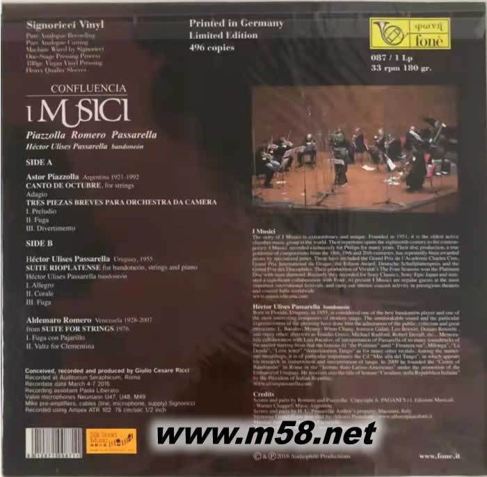 意大利音樂家合奏團(tuán)[接連 CONFLUENCIA 黑膠(m58.net) 1. 譽(yù)滿全球室樂團(tuán)「意大利音樂家合奏團(tuán)」自六十週年紀(jì)念特輯 「維瓦爾迪:四季」后另一新作。 2. 樸質(zhì)音色錄音系列 (natural sound recording) – 以現(xiàn)場實(shí)況收錄,不作后期修改調(diào)教,音色自然。 3. 演奏拉丁裔著名作曲家阿斯特‧皮亞佐拉(Astor Piazzolla), 阿迪馬羅·羅梅羅(Aldemaro Romero)及 赫克托‧烏利塞斯‧帕薩雷拉( Héctor Ulises Passarella)的精彩作品。