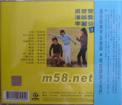 01. 古松 -吳楚楚 02. 我的思念 -潘越云 03. 星星 -吳楚楚 04. 海鷗飛吧 -李麗芬 05. 等待 -潘越云 06. 邂逅 -吳楚楚 07. 激蕩 -李麗芬 08. 留一盞燈 -潘越云 09. 一顆沙粒 -李麗芬 10. 明亮的季節 -潘越云 11. 大風吹 -吳楚楚