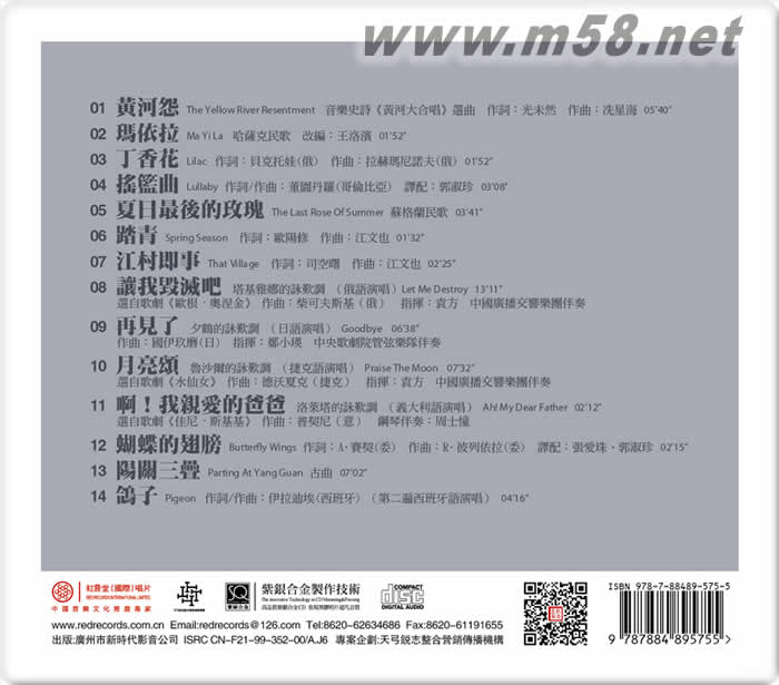 01 黃河怨 The Yellow River Resentment 05’40” 音樂史詩《黃河大合唱》選曲 作詞:光未然 作曲:冼星海 02 瑪依拉 Ma Yi La 01’52” 哈薩克民歌 改編:王洛濱 03 丁香花 Lilac 01’52” 作詞:貝克托娃(俄) 作曲:拉赫瑪尼諾夫(俄) 04 搖籃曲 Lullaby 03’08” 作詞/作曲:董園丹羅(哥倫比亞) 譯配:郭淑珍 05 夏日最后的玫瑰 The Last Rose Of Summer 03’41” 蘇格蘭民歌 06 踏青 Spring Season 01’32” 作詞:歐陽修 作曲:江文也 07 江村即事 That Village 02’25” 作詞:司空曙 作曲:江文也 08 讓我毀滅吧 塔基雅娜的詠嘆調 (俄語演唱)Let Me Destroy 13’11” 選自歌劇《歐根・奧涅金》 作曲:柴可夫斯基(俄) 指揮:袁方 中國廣播交響樂團伴奏 09 再見了 夕鶴的詠嘆調 (日語演唱) Goodbye 06’38” 作曲:國伊玖磨(日) 指揮:鄭小瑛 中央歌劇院管弦樂隊伴奏 10 月亮頌 魯沙爾的詠嘆調 (捷克語演唱) Praise The Moon 07’32” 選自歌劇《水仙女》 作曲:德沃夏克(捷克) 指揮:袁方 中國廣播交響樂團伴奏 11 啊!我親愛的爸爸 洛萊塔的詠嘆調 (義大利語演唱) Ah! My Dear Father 02’12” 選自歌劇《佳尼・斯基基》 作曲:普契尼(意) 鋼琴伴奏:周士憧 12 蝴蝶的翅膀 Butterfly Wings 02’15” 作詞:A·賽契(委) 作曲:R·彼列依拉(委) 譯配:張愛珠、郭淑珍 13 陽關三疊 Parting At Yang Guan 07’02” 古曲 14 鴿子 Pigeon 04’16” 作詞/作曲:伊拉迪埃(西班牙) (第二遍西班牙語演唱)