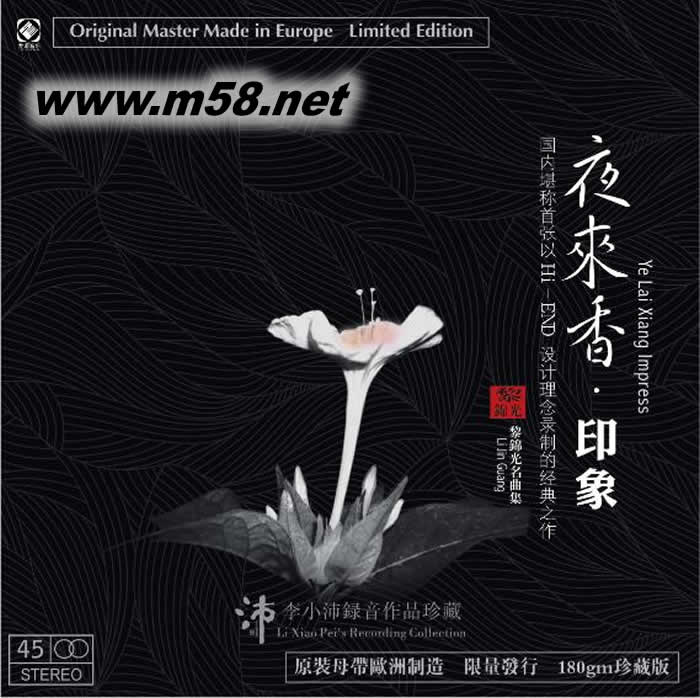 夜來(lái)香·印象 黎錦光名曲集 45轉(zhuǎn) 黑膠(m58.net) 歌曲《夜來(lái)香》改編成無(wú)伴奏混聲合唱版本,聲部分明,人聲動(dòng)態(tài)清晰飽滿;《哪個(gè)不多情》打動(dòng)人心,演唱者劉琳是黎錦光的外孫女,錄音人聲的定位真實(shí)悅耳,體現(xiàn)出錄音大師李小沛的高超水平;《滿場(chǎng)飛》充滿倫巴舞曲的節(jié)奏,仿若將人帶回?zé)艏t酒綠的老上海...同時(shí),上世紀(jì)30年代戲劇文化開(kāi)始蓬勃發(fā)展,音樂(lè)家黎錦光先生也為眾多電影提供歌曲,如為“華影”所拍攝電影《紅樓夢(mèng)》而作的《葬花》主奏二胡的是民樂(lè)大師明源先生,為戰(zhàn)后香港的一部國(guó)語(yǔ)電影《燕燕于飛》所作插曲《黃葉舞秋風(fēng)》,著名老電影《天涯歌女》插曲《襟上一朵花》等作品,將歌曲改編成純器樂(lè)曲,不失原作特點(diǎn)的同時(shí)畫(huà)面感極強(qiáng);同時(shí)富有濃厚鄉(xiāng)土情懷的《采檳榔》、《四季青》等根據(jù)民間小調(diào)所創(chuàng)作的作品,在編配時(shí)也遵循作曲家黎錦光先生的創(chuàng)作風(fēng)格來(lái)演繹。