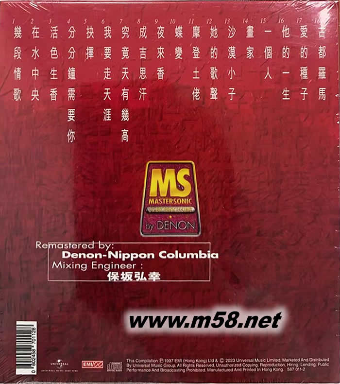 1 幾段情歌 [電影《我愛夜來香》插曲] 林子祥 2 在水中央 林子祥 3 活色生香 [電影《鬼馬智多星》主題曲] 林子祥 4 分分鐘需要你 林子祥 5 抉擇 [無綫電視劇《抉擇》主題曲] 林子祥 6 我要走天涯 林子祥 7 究竟天有幾高 林子祥 8 成吉思汗 林子祥 9 夜來香 林子祥 10 蝶變 [電影《蝶變》主題曲] 林子祥 11 摩登土佬 [電影《摩登土佬》主題曲] 林子祥 12 她的歌聲 林子祥 13 沙漠小子 林子祥 14 畫家 林子祥 15 一個人 林子祥 16 他的一生 [無綫電視劇《他的一生》主題曲] 林子祥 17 愛的種子之一 [無綫電視劇《他的一生》插曲] 林子祥 18 古都羅馬 林子祥