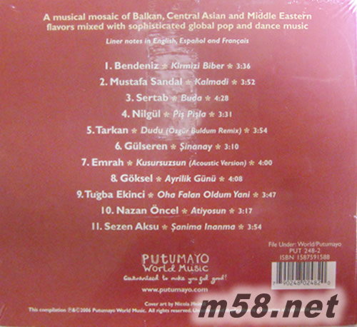 1. Bendeniz‧Kirmizi Biber 創(chuàng)作才女以魯特琴主奏的熱情中東味舞曲 2. Mustafa Sandal‧Kalmadi 風靡歐陸性感男星帥性駕馭吉普賽與中東節(jié)奏 3. Sertab‧Buda 土耳其最富盛名國際女星展現(xiàn)成熟韻味之選 4. Nilgul‧Pis Pisla 最耀眼新生代女星舒緩搖擺排行勁歌 5. Tarkan‧Dudu(Ozgur Buldum Remix) 土耳其之光代表男星散射無限魅力 6. Gulseren‧Sinanay 土國爆紅代表女星結合嘻哈與放克熱力 7. Emrah‧Kusursuzsun 演歌雙棲巨星運用大量手鼓輕快之作 8. Goksel‧Ayrilik Gunu 新進女星魅惑標準中東印度搖滾代表 9. Tugba Ekinci‧Oha Falan Oldum Yani 超美艷性感女歌手熱力之作大受男人歡迎 10. Nazan Oncel‧Atiyosun 中東嘻哈與饒舌配上齊特琴魯特琴的精采之作 11. Sezen Aksu‧Sanima Inanma 縱橫土國排行三十年老將挾吉普賽節(jié)奏魅力不減