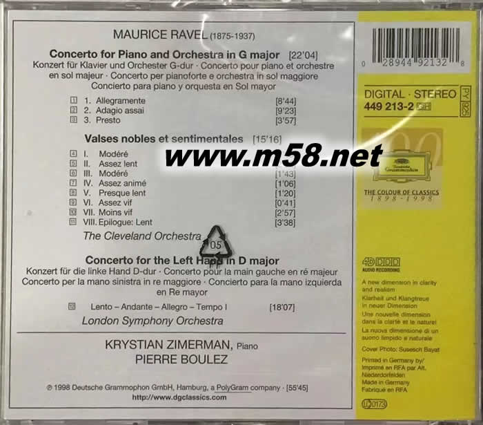 拉威爾:鋼琴協奏曲The Piano Concertos & Valses Nobles Et Sentimentales(m58.net) 拉威爾:G大調鋼琴協奏曲、左手鋼琴協奏曲、憂傷圓舞曲 / 齊瑪曼(鋼琴)/ 布列茲(指揮)克利夫蘭交響樂團,倫敦交響樂團 Ravel: The Piano Concertos, Valses nobles et sentimentales / Zimerman / Boulez