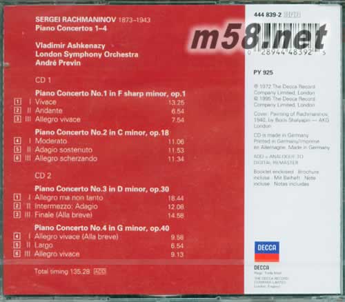拉赫瑪尼諾夫 鋼琴協(xié)奏曲(古典愛好者必備)(m58.net) 指揮:ANDRE PREVIN 阿什肯納齊的1997年出版的這套拉氏鋼琴全集,被認(rèn)為是所有版本中最出色的,英國(guó)權(quán)威《企鵝唱片指南》將這套唱片評(píng)為最高的“三星帶花”名片。阿什肯納齊的演奏極富詩(shī)意,音色明亮華麗,并且自然是充滿了俄羅斯的氣息。普烈文指揮的倫敦交響樂團(tuán)也被煥發(fā)出亮麗的色澤,既富氣勢(shì)又不喧賓奪主,與阿什肯納齊的鋼琴互為襯托。特別是第二鋼琴曲,聽了幾乎會(huì)讓人落淚.