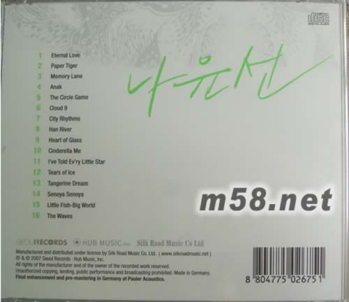 羅允宣 韓國發燒天后NAH YOUN SUN MEMORY LANE(m58.net) 一個人有太熟悉的名字但一把你絕對喜愛的動人聲線.紅遍歐洲的韓喬發燒天后羅允宣(NAH YOUN SUN)去年的"ANAK"及"HEART OF GLASS"妥別在兩大唱片公司之發燒天碟大放異彩.最新專輯[感情往事]除收錄了兩首樂曲外,更有永遠經典"CIRCLE GAME","I'VE TOLD DV'RY LITTLE STAR"及焦永小品"ETERNAL LOVE",PAPER TIGER"和"CHNDRELLA ME"等會完會改變你對靚聲的要求.