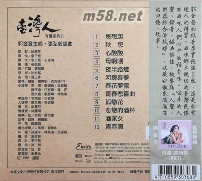 終極版音效擬真 / 獨立編號限量1000張 珍藏版 『人聲、樂器綜合測試碟』 這張專輯所以會入榜音響論壇 劉漢盛總編 100榜單, 不只是郭金發的歌聲,還有張弘毅的編曲及王基光的錄音也是不可或缺的因素 郭金發的低音厚實飽滿自然,每一首歌曲中,都會有低頻的震撼力,那震撼力不僅低沉且溫和,這是非常迷人的特質。回味鄉土親切的臺灣民謠亦回味人們心中的稻香味。 唱片的人聲、錄音、編曲俱佳,被譽為『人聲、樂器綜合測試碟』。 以高規格XRCD呈現, 新發售!!