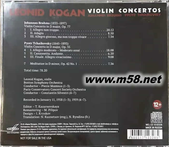 Violin Concertos 布拉姆斯/ 柴可夫斯基: 小提琴協(xié)奏曲/ 浪漫曲(m58.net) Leonid Kogan, Boston Symphony Orchestra, Pierre Monteux, Paris Conservatory Concert Society Orchestra, Constantin Silvestri、 布拉姆斯:小提琴協(xié)奏曲(官方版首度CD化!!) /*柴可夫斯基: 小提琴協(xié)奏曲/ 浪漫曲(op.42, No.1) 柯崗 (Leonid Kogan)小提琴 蒙都(Pierre Monteux)指揮 波士頓交響樂團 *Contantin Silvestri 指揮 巴黎音樂院管弦樂團 俄羅斯小提琴大師傳世名版 俄羅斯原裝進口,原廠母帶精心轉製