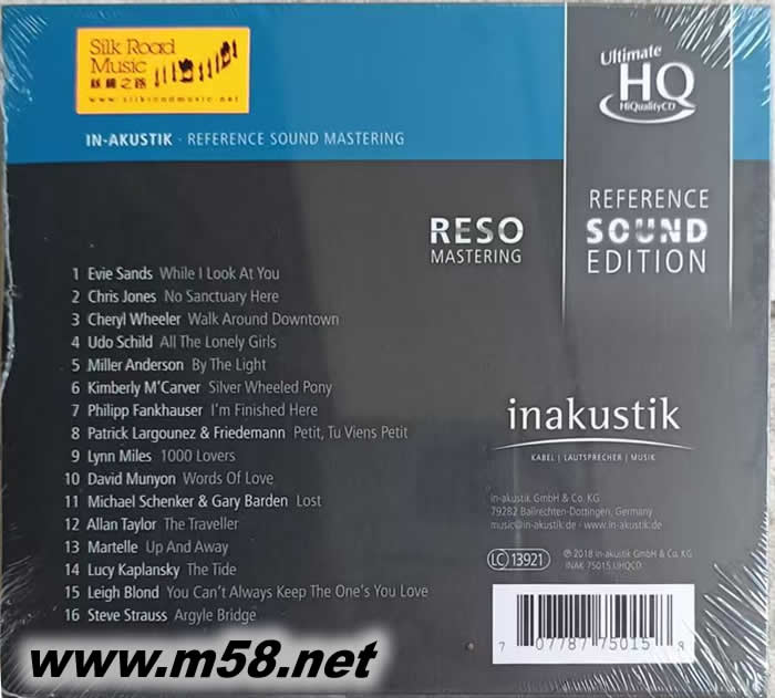 Great Voices, Vol. I 宏亮的嗓音-第1輯 德國原音第一張 UHQCD (INAKUSTIK宏亮系列)(m58.net) 音源對比母盤制作(RESO Mastering – Reference Sound Mastering)是採用現今最高解像度技術使原母盤內的音源效果得以改良和提升,清澈度更高,動態范圍更寬,低頻更重更深,是音響發燒友夢寐以求的音效。這種新制式配合以1:1直刻母盤精製180克處女膠造成的黑膠盤為載體便成為完美無瑕的配合?!竞炅恋纳ひ?Great Voices)】這專輯就是以這種高新技術制作,你可鑑賞到將每首歌的人聲和樂器聲更和暖和更具真實感,音色變得更晶瑩剔透,高音更清,中音更準,低音更重,音場更深更闊,動態更寬更廣,但又來得自然,加上各個唱者皆擁有一副動人的聲線,集合所有過人的優點,每首樂曲便成為天籟之聲, 當你細聽【Evie Sands: While I look at You(伊蕙‧桑德絲:當我凝望著你)】,【Chris Jones: No Sanctuary Here(克里斯‧瓊斯:這里沒有避難所)】,【Cheryl Wheeler: Walk Around Downtown(謝里爾.惠勒:在市中心走動)】,【Udo Schild: All The Lonely Girls(烏杜‧施爾德:所有孤獨的女孩)】【Miller Anderson: By The Light(米勒‧安德森:燈光旁)】, 【Kimberly M’Carver: Silver Wheeled Pony (金佰利‧麥克瓦:銀色的溜轉小馬)】、【Philipp Fankhauser: I’m Finished Here (菲利普‧凡克豪塞爾:我在此完結)】、【Patrick & Friedemann Largounez: Petit, tu viens petit(帕特里克及弗里德曼‧拉古內斯:孩子,因你小年紀)】、【Lynn Miles: 1000 Lovers(琳‧米拉絲:1000個情人)】【David Munyon: Words of Love(大衛‧繆雍:愛的宣言)】、【Michael Schenker & Gary Barden: Lost (邁克.申克爾及加里.巴登:迷失)】、【Allan Taylor: The Travellers(艾倫‧泰勒:旅行者)】、【Martelle Up and Away (馬蒂尼: 高飛離去)】、【Lucy Kaplansky: The Tide(露西‧卡班斯基:潮水)】、【Leigh Blond: You Can’t Always Keep The One’s You Love (利‧布朗德:你不能經常使你所愛留下)】及【Steve Strauss: Argyle Bridge(斯蒂芬‧斯特勞斯: 阿蓋爾橋)】等這些歌曲時,你便完全領略到這新制式確是音效完美之作,鑑聽必然之選。