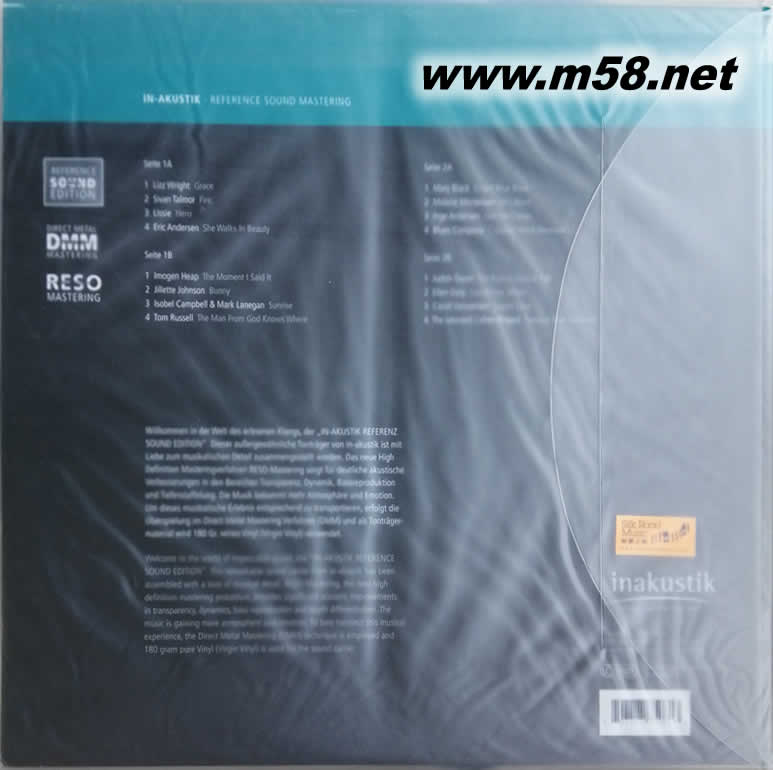 宏亮的嗓音 第3集 GREAT VOICES VOL.3 黑膠 (INAKUSTIK宏亮系列)(m58.net) 1. 這專輯的母盤是採用音源對(duì)比製作(RESO Mastering – Reference Sound Mastering),是現(xiàn)今最高解像度技術(shù)使原母盤內(nèi)的音源效果得以改良和提升,清澈度更高,動(dòng)態(tài)范圍更寬,低頻更重更深,是音響發(fā)燒友夢(mèng)寐以求的音效,這種新制式配合以金屬直刻母盤刻製的180克,33 1/3轉(zhuǎn),處女黑膠唱片為載體,效果更覺可人,別具韻味。 2. 因受到追求自然真實(shí)聲音美感為目標(biāo)的樂迷擊節(jié)讚賞,音源對(duì)比母盤製作系列之「宏亮的嗓音」將出版的第三輯(Great Voices, Vol. 3),你可繼續(xù)鑑賞到每首精挑歌曲愉悅清脆的人聲和晶瑩剔透的樂器聲,豐滿淳厚的音色、專業(yè)顯赫的音效和深濶的音場(chǎng)構(gòu)結(jié)成一張極具品味的示范名盤,讓你進(jìn)入聆聽更高境界。 3. 專輯中有十二首女聲和四首男聲歌曲,每位歌手皆擁有一副動(dòng)人的聲線,每首歌曲皆是他們各自的首本名曲,展現(xiàn)前所未有的聲音美感,亦是令樂迷魂?duì)繅?mèng)縈的人聲瑰寶。 4. 特別推薦不朽經(jīng)典" 著名的藍(lán)雨衣(Famous Blue Raincoat)"由原唱者,殿堂級(jí)男歌手李歐納‧柯恩(Leonard Cohen)親自演繹的現(xiàn)場(chǎng)版本,他將原曲的神情韻味以難以超越,每可替代的姿態(tài)全面呈現(xiàn)。