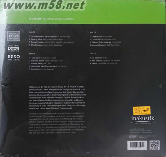 黑膠唱片 1 1. Chris Farlowe & The Thunderbirds: All The Way Lover 2. Friend 'n Fellow: Here Comes The Rain Again 3. Sophie B. Hawkins: Damn I Wish I Was Your Lover 4. Chris Thompson: Davi's On The Road Again 5. Leela James: It Hurts Me So Much 6. Gary Barden: When A Blind Man Cries 7. Caroline Hering: True Colors 8. Payne, Jackie & Steve Edmonson Band: Just The One 9. John Gorka: Just Like A Woman 黑膠唱片 2