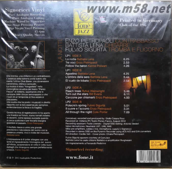 LA NOTTE 夜 爵士四重奏 Yatra 雙黑膠(m58.net) 恩佐‧皮埃特羅帕里爵士樂四重奏(Enzo Pietropaoli Quarter)是當今意大利最具實力和最受歡迎的爵士樂隊之一,其成員包括低音結他手恩佐‧皮埃特羅帕里(Enzo Pietropaoli),小號手弗維奧‧西古達(Fulvio Sigurta),琴鍵手朱利安‧馬斯薩里爾盧(Julian Mazzariello)及鼓手亞歷山德羅‧帕特尼斯(Alessandro Paternesi),他們都是首屈一指的著名樂手,他們以純熟的技術,合作無間地演奏多首創新作品包括【Il Mare Di Fronte(面向的海)】,【Smooth And Blue(平滑與蔚藍)】,【Pour Que L’Amour Me Quitte(如此愛你的眼睛)】,【Il Cuore e L’Azzurro(心與藍色)】,【Wise Up(聰明起來)】,【Wild Horses(野馬)】及【Elliptical Song(橢圓形之歌)】,CD版多錄【Onda Minore(微波蕩漾)】,【Tum Ko Dheka(圖姆‧科‧赫卡)】和【Quella Cosa In Lombardia(奎拉在倫巴第發生的事情)】,配以最新、最先進的錄音器材和技術,傳真地收錄這些精彩歌曲,加上后期處理由著名錄音師里玆(Giulio Cesare Ricci)操刀處理, 全球限量496張的24K金CD為載體,聲效更為顯著, 帶來更完美更真實的發燒爵士樂鑑聽盤。