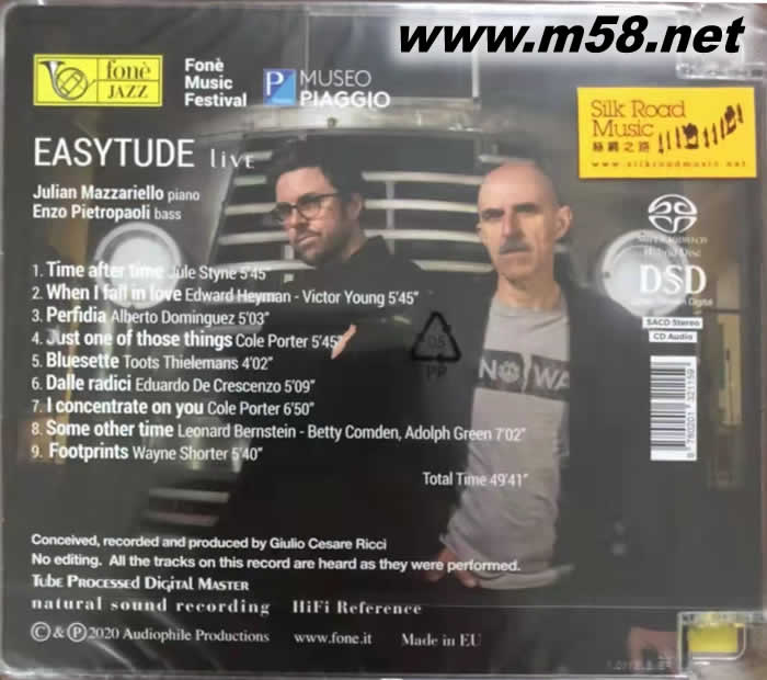 「比亞喬博物館」現(xiàn)場(chǎng)音樂會(huì)系列 - 輕松情調(diào)Live At Museo Piaggio - EASYTUDE Live (鋼琴與大提琴) SACD(m58.net) Julian Mazzariello (鋼琴) Enzo Pietropaoli (低音大提琴) 馬斯薩里爾羅鋼琴/皮埃特羅帕里低音大提琴SACD,鋼琴演奏行云流水,低音提琴色彩繽紛,演奏現(xiàn)場(chǎng)全情投入,里茲錄音! 1. 1978年出生於英國(guó)的意大利裔爵士樂鋼琴手朱利安.馬斯薩里爾盧(Julian Mazzariello)七歲開始習(xí)琴時(shí)已對(duì)「即興演奏」極感興趣。十七歲移居意大利后活躍於當(dāng)?shù)鼐羰繕穳詮椬嗔鲿硟?yōu)雅,和聲精致見稱,特別是即興時(shí)的彈奏和其他樂手的互動(dòng),更是精彩萬(wàn)分。 2. 恩佐.皮埃特羅帕里(Enzo Pietropaoli)出生於熱拿亞(Geona)而成長(zhǎng)於羅馬(Rome),是現(xiàn)今意大利著名古典音樂和爵士樂低音大提琴手。在四十年的職業(yè)生涯,他到過(guò)歐洲、北美和南美、亞洲和非洲作巡迴演出,亦曾與多位著名爵士樂手合作,嫻熟優(yōu)秀的琴技為他在爵士樂壇帶來(lái)不少榮譽(yù),備受讚賞。 3. 馬斯薩里爾盧和皮埃特羅帕里兩人於2019年3月26日在意大利蓬泰德拉(Pontedera)「比亞喬奧博物館」(Museo Piaggio)大禮堂由意大利殿堂級(jí)錄音師里玆(Giulio Cesare Ricci)所創(chuàng)立的【豐力】唱片公司(fonè)所舉辦的音樂會(huì)使出渾身解數(shù),落力表演,整個(gè)過(guò)程,精彩絕倫。 4. 「比亞喬奧(Piaggio)」是意大利著名摩托車生產(chǎn)商,其博物館內(nèi)的大禮堂音響設(shè)計(jì)、設(shè)備和效果都非常出色,極為適合音樂會(huì)的演出和錄音用途。作為專業(yè)錄音師的里茲挑選這禮堂作為他旗下的歌星、樂手和樂隊(duì)的演出場(chǎng)地,一定是切合他對(duì)音響效果嚴(yán)格的要求。 5. 整個(gè)音樂會(huì)的演出盡顯馬斯薩里爾盧的彈奏緩慢時(shí)如小河淌水,急速時(shí)如潮拍海岸,琴音清脆明亮。皮埃特羅帕里的低音大提琴的拉奏動(dòng)態(tài)十足,色彩繽紛的琴音如泣如訴地伴隨,兩位樂手全情投入,使出渾身解數(shù),淋漓盡致地演繹九首精彩樂曲,加上里茲採(cǎi)用精巧的器材,負(fù)責(zé)由錄音至母盤製造整個(gè)製作過(guò)程,配合以SACD為載體,自然真實(shí)的空間感,晶瑩剔透的樂器音質(zhì),使人越聽越有味道。