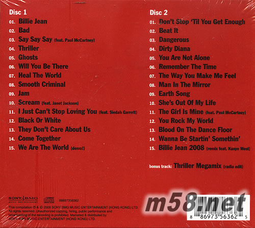 Disc 1 01. Billie Jean 02. Bad 03. Say Say Say(feat.Paul McCartney) 04. Thriller 05. Ghosts 06. Will You Be There 07. Heal The World 08. Smooth Criminal 09. Jam 10. Scream(feat.Janet Jackson) 11. I Just Can't Stop Loving You(feat.Siedah Garrett) 12. Black Or White 13. They Don't Care About Us 14. Come Together 15. We Are The World(demo!) Disc 2 01. Don't Stop Til You Get Enough 02. Beat It 03. Dangerous 04. Dirty Diana 05. You Are Not Alone 06. Remember The Time 07. The Way You Make Me Feel 08. Man In The Mirror 09. Earth Song 10. She's Out Of My Life 11. The Girl Is Mine(feat.Paul McCartney) 12. You Rock My World 13. Blood On The Dance Floor 14. Wanna Be Startin' Somethin' 15. Billie Jean 2008(remix feat.Kanye West)