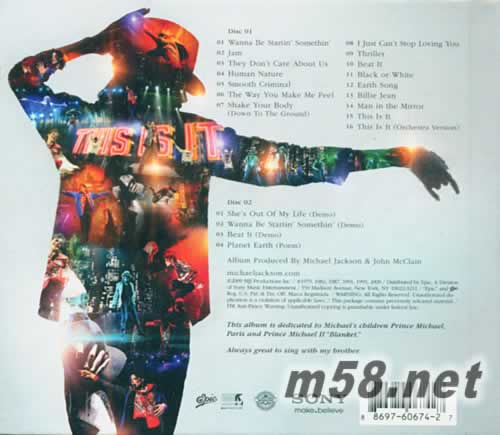 This Is It 美國版 2CD+36頁獨家彩排照片(m58.net) CD1提供了一些MJ以往的經典歌曲,歌曲順序按電影中排序 CD1還收錄兩首從未發表的"THIS IS IT“版本 CD2收錄了一些MJ經典歌曲的從未曝光版本 CD2收錄了一首MJ親自朗誦的詩歌“Planet Earth”,之前也從未曝光 歌書是長達36頁的MJ最后彩排的照片