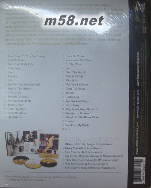 DVD規(guī)格 全區(qū) 2D9+1D5 無字幕 長度約4個半小時 1 -1 Don't Stop 'Til You Get Enough [DVD] 1 -2 Rock With You [DVD] 1 -3 She's Out of My Life (DVD首次收錄) [DVD] 1 -4 Billie Jean [DVD] 1 -5 Beat It [DVD] 1 -6 Thriller [DVD] 1 -7 Bad [DVD] 1 -8 The Way You Make Me Feel [DVD] 1 -9 Man in the Mirror [DVD] 1 -10 Dirty Diana [DVD] 1 -11 Smooth Criminal [DVD] 1 -12 Another Part of Me [DVD] 1 -13 Speed Demon [DVD] 1 -14 Come Together [DVD] 1 -15 Leave Me Alone [DVD] 1 -16 Liberian Girl [DVD] 2 -1 Black or White [DVD] 2 -2 Remember The Time [DVD] 2 -3 In the Closet [DVD] 2 -4 Jam [DVD] 2 -5 Heal the World [DVD] 2 -6 Give in to Me [DVD] 2 -7 Who Is It [DVD] 2 -8 Will You Be There [DVD] 2 -9 Gone Too Soon [DVD] 2 -10 Scream [DVD] 2 -11 Childhood [DVD] 2 -12 You Are Not Alone [DVD] 2 -13 Earth Song [DVD] 2 -14 They Don't Care About Us [DVD] 2 -15 Stranger in Moskow [DVD] 2 -16 Blood on the Dancefloor [DVD] 2 -17 Ghosts(DVD首次收錄) [DVD] 2 -18 You Rock My World (DVD首次收錄)[DVD] 2 -19 Cry (DVD首次收錄)[DVD] 3 -1 Blame It on the Boogie - The Jacksons (DVD首次收錄) DVD 3 -2 Enjoy Yourself - The Jacksons (DVD首次收錄) DVD 3 -3 Can You Feel It - The Jacksons (DVD首次收錄) DVD 3 -4 Say Say Say - Paul McCartney & Michael Jackson [DVD] 3 -5 They Don't Care About Us - Prison version (DVD首次收錄) DVD 3 -6 Why? - 3T featuring Michael Jackson (DVD首次收錄) DVD 3 -7 One More Chance - previously unreleased (DVD首次收錄) DVD