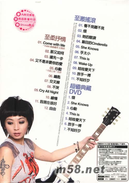 至激搖滾 1、看不見聽不見 2、煩 3、她的眼淚 4、盲目的CINDERELLA 5、SHE KNOWS 6、手太小 7、THIS IS 8、WAKE UP 9、娃娃愛天下 10、放手一博 11、不知好歹 12、自由 至柔至情 1、COME WITH ME 2、那又如何 3、搶先一步 4、又不是非要你的愛 5、心動 6、鎖匙 7、交叉線 8、不哭 9、緩慢 10、CRY ALL NIGHT 11、我現在很好 超值典藏 DVD 1、煩 2、SHE KNOWS 3、心動 4、THIS IS 5、娃娃愛天下 6、放手一博 7、不知好歹