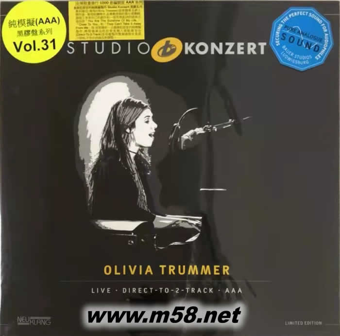 純仿真制作—奧利維亞 頌瑪 Studio Koncert (AAA Series) : Olivia Trummer 爵士 黑膠(m58.net) 接近原音的純模擬製作—Studio Konzert黑膠系列 由現場錄音,直接入兩軌模擬錄音臺(Direct-To-2-Track)至母盤制作整個過程全是模擬制作(AAA) 全球限量發行1000套編號版 1. 奧利維亞.頌瑪(Olivia Trummer)是德國斯圖加特(Stuttgart)著名爵士樂作曲、歌唱和鋼琴手,肄業於[斯圖加特音樂大學(University of Music in Stuttgart)],曾獲得到多個音樂獎項,於2014年被邀在英國著名的[倫敦爵士音樂節(London Jazz Festival)]演出,演出備受樂迷擊節讚賞,從而奠定她在歐洲爵士樂壇崇高地位。 2. 頌瑪年紀雖輕但多才多藝,擁有清澈明亮的聲線,加上其深厚的音樂根基,她對樂曲的精心編排融合其熟練和多元化的技巧,使她更能全面發揮每首演繹歌曲的特質,尤其是爵士樂現場即興的演出,更是如魚得水,相得益彰。 3. 頌瑪的第七張專輯是現場實況演出的純模擬黑膠盤(AAA series)製作,演出的音樂人需擁有高水平的演唱或演奏技巧,豐富的演出經驗,最重要是不可或缺的信心,因為此種製作是將演出一氣呵成地紀錄,接連地不會停止或再試,頌瑪完全具備這些條件,她在這專輯完全展示她這些過人的特質。 4. 頌瑪演唱了多首自己的創作和一些耳熟能詳的經典名曲包括「You Are The Sunshine Of My Life(你是我生命中的陽光)」、「Close To You(親近你)」和「They Can't Take It Away From Me(你不能從我手中取走它)」等,首首精彩。 5. 以最接近原音的純模擬製作,將現場演出的拾音直接入兩軌錄音臺(Direct-To-2-Track)至母盤製作整個過程全是原汁原味,不作任何修改和調整,絕對是最傳真的(AAA) 製作,加上全球限量發行1000套編號版,更屬珍貴。