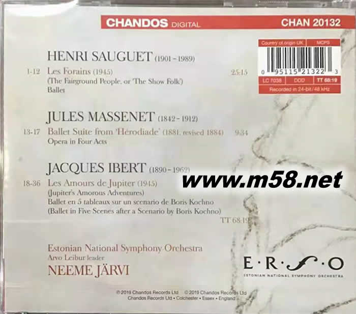 法國芭蕾舞音樂French Music For Ballet 勁爆芭蕾(m58.net) Estonian National Symphony Orchestra 愛沙尼亞國家交響樂團, Neeme Järvi 葉維 罕有精彩輯錄3位近代法國作曲家: 索蓋(Henri Sauguet)/ 馬斯奈(Jules Massenet)/ 易伯特(Jacques Ibert ) 芭蕾舞音樂 高傳真錄音規格(24-bit/48 kHz), 樂感呼之欲出; 豐沛的管弦樂感綿延不絕,令人嘆為”聽”止 英國原裝進口
