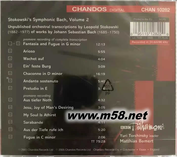 斯托克夫斯基改編的巴赫作品(2) STOKOWSKI'S SYMPHONIC BACH 第二集(m58.net) 包括:幻想與賦格、詠嘆調、康塔塔:醒來吧、在苦難的深淵里、眾望吾主、恰空、前奏曲及清唱劇選段, 巴墨特指揮,BBC愛樂樂團