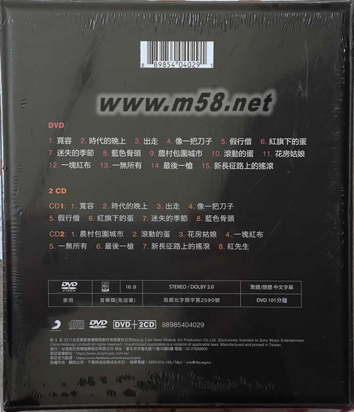 DVD Video 1,寬容。 2,時代的晚上。 3,出走。 4,像一把刀子。 5,假行僧。 6,紅旗下的蛋。 7,迷失的季節。 8,藍色骨頭。 9,農村包圍城市。 10,滾動的蛋。 11,花房姑娘。 12,一塊紅布。 13,一無所有。 14,最后一槍。 15,新長征路上的搖滾。 CD Disc CD1 1,寬容。 2,時代的晚上。 3,出走。 4,像一把刀子。 5,假行僧。 6,紅旗下的蛋。 7,迷失的季節。 8,藍色骨頭。 CD2 1,農村包圍城市。 2,滾動的蛋。 3,花房姑娘。 4,一塊紅布。 5,一無所有。 6,最后一槍。 7,新長征路上的搖滾。 8,紅先生 影片規格: NTSC 區域:全區 畫面比例 720*480 16:9 聲音規格: 立體聲DOLBY 2.0 字幕: 繁體中文/簡體中文 影片長度:01:40:57 (101分鐘)