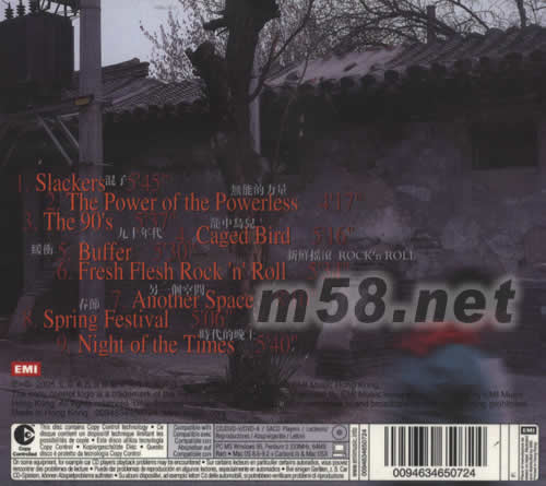 01. Slackers 混子 02. The Power of the Powerless 無能的力量 03. The 90's 九十年代 04. Caged Bird 籠中鳥兒 05. Buffer 緩沖 06. Fresh Flesh Rock'n'Roll 新鮮搖滾Rock'n Roll 07. Anotner Space 另一個空間 08. Spring Festival 春節 09. Night of the Times 時代的晚上