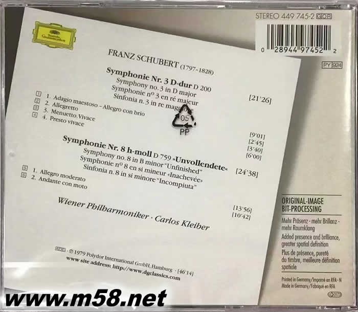 舒伯特:第3 & 8交響曲 Carlos Kleiber - Schubert: Symphonies Nos. 3 & 8 大禾花版(m58.net) 2009年《企鵝古典唱片指南》推薦為三星。 卡洛斯?克萊伯(Carlos Kleiber,1930-2004):德國指揮大師。其父便是大名鼎鼎的指揮家埃里希?克萊伯。克萊伯的指揮有力、新鮮、深刻、流暢、富有激情、具有生動的現代感。近年來,他不擔任任何一個歌劇院和樂團的常任指揮,是目前世界上唯一一個按每分鐘來收費的客席指揮家。克萊伯錄制的唱片數量不多,而且張張都精致、出色。可能因為曲目、演出、錄音較少,加上其極高的指揮水平和極為感人的演出效果,他成為歐洲最為搶手的指揮。 《No.8交響曲》不僅是舒伯特交響曲中最杰出的作品,也是浪漫音樂的一部絕世佳作。它抒發了作者內心世界的矛盾沖突,憂傷情緒充滿了整個樂曲。透明清純、優美豐富的旋律,不加裝飾的和聲和音色,這種非常新鮮的作曲手法,成就了此曲的世界上最受歡迎的交響曲之一的地位。