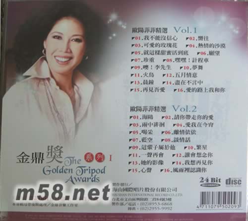 歐陽菲菲精選Vol.1 01. 我不能沒信心 02. 向往 03. 可愛的玫瑰花 04. 熱情的沙漠 05. 就這樣甜蜜活到底 06. 愿望 07. 珍重 08. 嘿嘿!計程車 09. 噢!李先生 10. 夢舞 11. 火鳥 12. 五月情意 13. 晨鐘 14. 盡在不言中 15. 再見吾愛 16. 愛的路上我和你 歐陽菲菲精選Vol.2 01. 海鷗 02. 請你帶走你的愛 03. 雨中徘徊 04. 愛我在今宵 05. 喝采 06. 離情依依 07. 藍空 08. 談情話 09. 這輩子屬于他 10. 繁星 11. 一聲再會 12. 誰會想念你 13. 她的影像 14. 我想再見你 15. 心聲 16. 風雨中認識你