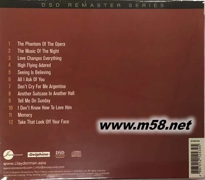 LOVE SONGS OF ANDREW LLOYD WEBBER(m58.net) 理查德·克萊德曼在鋼琴上最流暢、最精彩的演奏,將韋伯的作品迷住。 《安德魯·勞埃德·韋伯的情歌》是一張錄音室專輯,收錄了7部安德魯·勞埃德·韋伯音樂劇的12首歌曲,包括《歌劇魅影》和《埃維塔》。 這張專輯已經(jīng)在世界各地以多種形式發(fā)行,如《安德魯·勞埃德·韋伯之最》和《理查德·克萊德曼之面》。 在歐洲利用DSD(直達(dá)流數(shù)字)技術(shù)重新錄制,增強(qiáng)了這些經(jīng)典錄音的美妙聲音,讓發(fā)燒友們能聽到美妙的聲音,許多曲目現(xiàn)在都是克萊德曼經(jīng)典曲目。 由奧利維爾·圖桑構(gòu)思和編排,保羅·德·塞內(nèi)維爾和奧利維爾·圖桑制作,這是一部真正的經(jīng)典杰作。