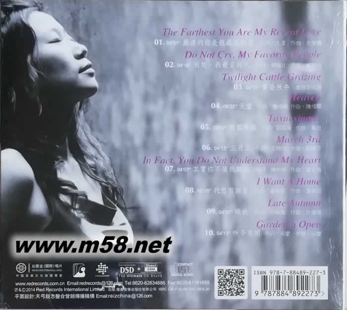 01. The Farthest You Are My Recent Love 04'51'' 最遠的你是我最近的愛 作詞:沈凌 作曲:史俊鵬 02. Do Not Cry, My Favorite People 04'18" 別哭,我最愛的人 作詞:鄭智化 作曲:鄭智化 03. Twilight Cattle Grazing 04'15" 黃昏放牛 墨西哥民謠 04. Heaven 06'25" 天堂 作詞:騰格爾 作曲:騰格爾 05. Taxuexinmei 03'52" 踏雪尋梅 作詞:劉雪庵 作曲:黃自 06. March 3rd 04'13" 三月三 作詞:王曉玲 作曲:穀建芬 07. In Fact, You Do Not Understand My Heart 04'07" 其實你不懂我的心 作詞:陳桂珠 作曲:童安格 08. I Want A Home 06'08" 我想有個家 作詞:潘美辰 作曲:潘美辰 09. Late Autumn 04'55" 晚秋 作詞:許建強 作曲:許建強 10. Gardenia Open 04'13" 梔子花開 作詞:吳孌 作曲:吳孌