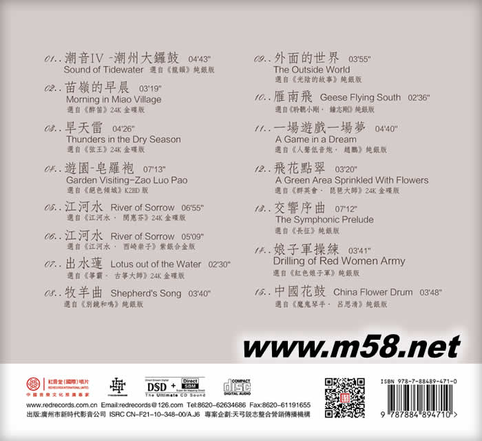 01..潮音IV -潮州大鑼鼓 選自《龍韻》 純銀版 04'43'' Sound of Tidewater 02..苗嶺的早晨 選自《醉笛》 24K金碟版 03'19'' Morning in Miao Village 03..旱天雷 選自《弦王》24K金碟版 04'26'' Thunders in the Dry Season 04..游園-皂羅袍 選自《絕色傾城》 K2HD版 07'13'' Garden Visiting-Zao Luo Pao 05..江河水 選自《江河水·閔惠芬》24K金碟版 06'55'' River of Sorrow 06..江河水 選自《江河水·西崎崇子》紫銀合金版 05'09'' River of Sorrow 07..出水蓮 選自《箏霸·古箏大師》 24K金碟版 02'30'' Lotus out of the Water 08..牧羊曲 選自《別鏡和鳴》 純銀版 03'40'' Shepherd's Song 09..外面的世界 選自《光陰的故事》 純銀版 03'55'' The Outside World 10..雁南飛 選自《聆聽小剛·鐘志剛》 純銀版 02'36'' Geese Flying South 11..一場游戲一場夢 選自《人聲低音炮·趙鵬》 純銀版 04'40'' A Game in a Dream 12..飛花點翠 選自《群英會·琵琶大師》 24K金碟版 03'20'' A Green Area Sprinkled With Flowers 13..交響序曲 選自《長征》 紫銀合金 07'12'' The Symphonic Prelude 14..娘子軍操練 選自《紅色娘子軍》 純銀版 03'41'' Drilling of Red Women Army 15..中國花鼓 選自《魔鬼琴手·呂思清》 純銀版 03'48'' China Flower Drum