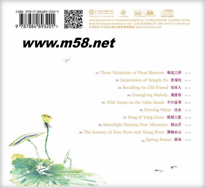 01 梅花三弄 07:18 Three Variations of Plum Blossom 02 普庵咒 05:44 Incantation of Temple Pu 03 憶故人 08:51 Recalling An Old Friend 04 廣陵散 07:20 Guang Lin Melody 05 平沙落雁 08:52 Wild Geese on the Calm Sands 06 流水 06:35 Flowing Water 07 陽關(guān)三疊 05:28 Song of Yang Guan 08 關(guān)山月 02:29 Moonlight Shining Over Mountain 09 瀟湘水云 11:55 The scenery of Xiao River and Xiang River 10 春風(fēng) 05:54 Spring Breeze