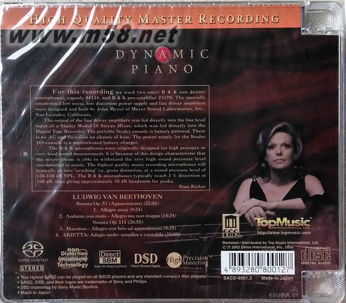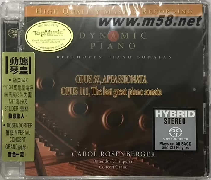 DYNAMIC PIANO動態琴皇 SACD(m58.net) 請點看產品正、背面大圖 CAROL ROSENBERGER 動態琴皇 動用B&K#413高耐壓電容咪高風(30%失真) MT導線及STUDER器材 動態驚人 BOSENDORFER頂級IMPERIAL CONCERT GRAND鋼琴,音色一流 MADE IN JAPAN 動態琴皇》(Dynamic Piano)的內容選取了貝多芬第23號鋼琴奏鳴曲《熱情》,f小調,OP.57以及貝多芬第32號鋼琴奏鳴曲,e小調,OP.111(貝多芬最后一首鋼琴奏鳴曲),由女鋼琴家卡露?羅遜貝嘉(Carol Rosenberger)用貝森朵夫頂級型號鋼琴演奏。Carol Rosenberger精湛出色的演奏技巧被樂評譽為充滿活力與激情,她在專輯中演奏了貝多芬著名的No. 23 & 32鋼琴奏鳴曲。 No. 23是貝多芬最杰出的鋼琴作品之一,No. 32則是貝多芬將形式與內涵完美結合的集大成者。Carol Rosenberger琴聲力道強勁,演奏水平和表現手法非常具有感染力,豐富的感情和得體高雅的演繹,充分展現出了她的想象力,把貝多芬奏鳴曲的火花和熱力發揮得淋漓盡致。 經過MIT頂級線材、美國著名錄音室Meyer Sound Laboratories, Inc. 和OMNI B & K錄音器材的精心錄制,再經過著名的錄音師Stan Ricker對錄制鋼琴技巧的創意,造就了這張鋼琴錄音的極品之作。錄音師特別強調錄音器材對音壓、失真和動態的要求極高。高水平演奏家和要求極高的錄音師再加上眾多名牌器材,這個極品之作值得期待! 貝森朵夫(Bosendorfer)是擁有175年悠久歷史的著名手工制作鋼琴品牌,旗下擁有“皇者”、“施華洛世奇水晶”、“維也納”等周年珍藏紀念版型號頂級鋼琴。貝森朵夫被奧地利國王冊封為“皇家鋼琴”,著名音樂家巴斯奈克這樣評價貝森朵夫的鋼琴:“貝森朵夫的鋼琴不僅僅是一件華美的樂器,更體現了維也納經典的音樂傳統?!币虼似渲谱鞯匿撉俳洺1粖W地利政府當作國禮相贈,而“皇者”則是貝森朵夫最華麗、最具特色的頂級珍品之一,琴身的每一個金屬部分都由純金鑄造,其考究的用料、精湛的工藝、純美的音色無一不令世人矚目。