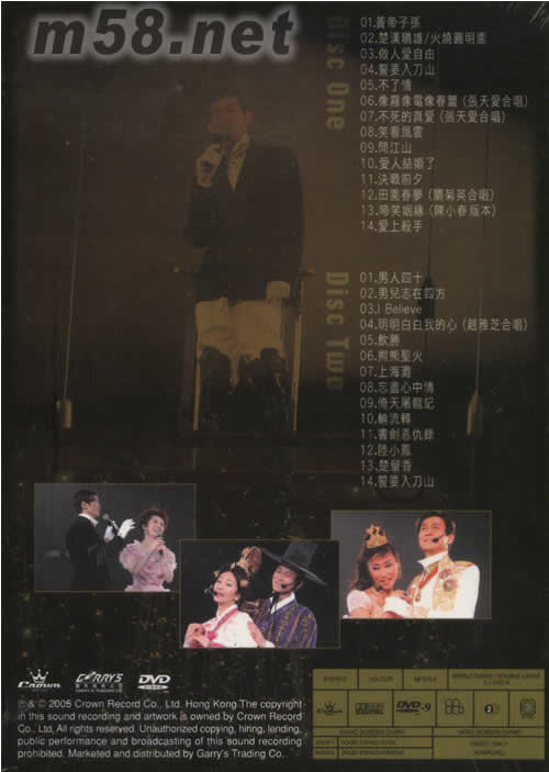 Disc One 01. 黃帝子孫 02. 楚漢驕雄/火燒圓明園 03. 做人愛(ài)自由 04. 誓要入刀山 05. 不了情 06. 像霧像電像春蕾(張?zhí)鞇?ài)合唱) 07. 不死的真愛(ài)(張?zhí)鞇?ài)合唱) 08. 笑看風(fēng)云 09. 問(wèn)江山 10. 愛(ài)人結(jié)婚了 11. 決戰(zhàn)前夕 12. 田園春夢(mèng)(關(guān)菊英合唱) 13. 啼笑姻緣(陳小春版本) 14. 愛(ài)上殺手 Disc Two 01. 男人四十 02. 男兒志在四方 03. I Believe 04. 明明白白我的心(趙雅芝合唱) 05. 飲勝 06. 熊熊圣火 07. 上海灘 08. 忘盡心中情 09. 倚天屠龍記 10. 輪流轉(zhuǎn) 11. 書(shū)劍恩仇錄 12. 陸小鳳 13. 楚留香 14. 誓要入刀山