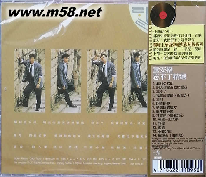 忘不了精選(留聲經(jīng)典復(fù)刻版系列)(m58.net) 任誰的心中, 都會想要緊緊抓住這樣的一首歌 還好,我們留下了這些聲音 環(huán)球上華留聲經(jīng)典復(fù)刻版系列 精選寶麗金、綜一、華星、環(huán)球、上華...等等時期 經(jīng)典專輯 現(xiàn)在,低價回饋給深愛音樂的你