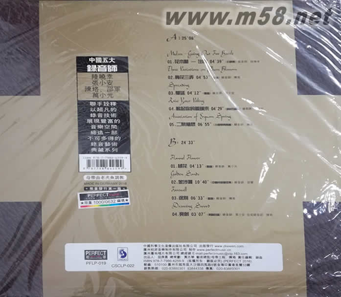 以下是同名CD曲目,黑膠曲目次序不同。 1.花木蘭——出征(打擊樂) 錄音師:陸曉幸 演奏:澳大利亞打擊樂團 2.梅花三弄(歌曲) 錄音師:陳珞 演唱:古璇 3.金沙灘(中國民族管弦樂) 錄音師:邵軍 演奏:中央民族樂團 4. 蔓延(歌曲) 錄音師:張小安 演唱:譚晶 5.掀起你的蓋頭來(銅管五重奏) 錄音師:萬小元 演奏:中國銅管五重奏組 6.送別(歌曲) 錄音師:陳珞 演唱:崔崢嶸 7.亮劍(男聲合唱) 錄音師:張小安 合成錄音師:陳珞 演唱:北京室內男聲合唱團演唱 8.絨花(歌曲) 錄音師:萬小元 演唱:譚晶 9.二泉隨想(小提琴與樂隊) 錄音師:陳珞、張軍軍 演奏:劉云志 協奏:中國交響樂團 10.羅馬松樹——羅馬大道 錄音師:邵軍 演奏:奧斯陸交響樂團