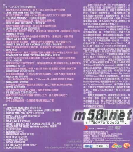 CD 1. 3 三人行不行〈全新曲目〉 直取全美百大單曲榜冠軍,寫下三年來首度空降第一的紀錄,風光再創生涯高峰 2. ...Baby One More Time 愛的初告白 拿下首支多國NO.1單曲,入選MTV+滾石雜誌「史上百大流行經典歌曲」名單 3.(You Drive Me) Crazy (你讓我)神魂顛倒 強勁舞曲韻味颳起甜甜炫風,衝上英國金榜第5名,西班牙、比利時相繼摘冠 4. Born To Make You Happy 只要你快樂 釋放對情愛最溫柔的呼喚,感人至深的再次征服英國金榜+愛爾蘭流行榜 5. Oops!...I Did It Again 愛的再告白 入圍葛萊美「最佳流行女歌手」獎項,奠定下一位舉世矚目的國際巨星之關鍵 6. Stronger 更堅強 更為自信滿滿的唱出US流行單曲銷售榜單週冠軍曲,獲頒金唱片銷售認證 7. I'm a Slave 4 U 愛情奴隸 頗具爭議的性感初體驗,驚艷全球的搶足媒體所有版面與鋒頭,坐上英國Top4 8. I'm Not A Girl,Not Yet A Woman 少女已過,熟女未滿 英國才女蒂朵跨刀譜寫,首部螢幕處女秀「布蘭妮要怎樣Crossroads」宣傳曲 9. Boys 男孩 與全方位鬼才菲董Pharrell替電影「王牌大賤諜3-夠MAN吧」再掀話題 10. Me Against The Music featuring Madonna 嗆音樂 兩大世代天后過癮十足的終極交鋒,抱走Billboard「年度最佳銷售舞曲」加冕 11. Toxic 中你的毒 發騷破錶的MV視覺感官享受,領取第一座葛萊美「最佳舞曲錄音」獎項肯定 12. Everytime 每一次 風雨道盡布蘭妮成名后的壓力承受,催人落淚的小品雙雙登記英國+澳洲冠軍 13. Gimme More 再危險 我也要 再度勇敢復出歌壇,通上強力高壓電氣頻率,熱辣辣的勾引出性感挑逗音軌 14. Piece Of Me 破碎的我 一舉一動都成為狗仔追逐焦點,藉此曲回敬那些曾大肆報導她的媒體工作人員 15. Womanizer 愛情玩咖 以96名攻上冠軍的升幅改寫登頂告示牌歷史紀錄,數位下載銷售以來最強單曲 16. Circus 妮裳馬戲團 充滿更跳的節拍、更來電的順暢音線,脫胎換骨的大展前衛敢秀之膽識 17. If U Seek Amy 如果你找到Amy 建構在Electro-Pop韻腳下的惹火之作,讓人毫無招架之力的隨樂起舞擺動 18. Radar 愛情雷達 吸取飽滿的電子養分,攻佔全歐舞曲市場,同時引發夜店舞池高潮的主打歌 1 3 三人行不行 2 ...Baby One More Time 愛的初告白 3 (You Drive Me) Crazy (你讓我)神魂顛倒 4 Born to Make You Happy 只要你快樂 5 Oops!...I Did It Again 愛的再告白 6 Stronger 更堅強 7 I'm a Slave 4 U 愛情奴隸 8 I'm Not a Girl, Not Yet a Woman 少女已過,熟女未滿 9 Boys 男孩 10 Me Against the Music featuring Madonna 嗆音樂 11 Toxic 中你的毒 12 Everytime 每一次 13 Gimme More 再危險 我也要 14 Piece of Me 破碎的我 15 Womanizer 愛情玩咖 16 Circus 妮裳馬戲團 17 If U Seek Amy 如果你找到Amy 18 Radar 愛情雷達 1 ...Baby One More Time 愛的初告白 DVD 2 (You Drive Me) Crazy (The Stop Remix!) (你讓我)神魂顛倒 DVD 3 Born to Make You Happy 只要你快樂 DVD 4 Oops!... I Did It Again 愛的再告白 DVD 5 Stronger 更堅強 DVD 6 I'm a Slave 4 U 愛情奴隸 DVD 7 I'm Not a Girl, Not Yet a Woman 少女已過,熟女未滿 DVD 8 Me Against the Music (featuring Madonna) 嗆音樂 DVD 9 Toxic 中你的毒 DVD 1 Everytime 每一次 DVD 11 Gimme More 再危險 我也要 DVD 12 Piece of Me 破碎的我 DVD 13 Womanizer 愛情玩咖 DVD 14 Circus 妮裳馬戲團 DVD 15 If U Seek Amy 如果你找到Amy DVD 16 Radar 愛情雷達 DVD 《內附中英文歌詞》